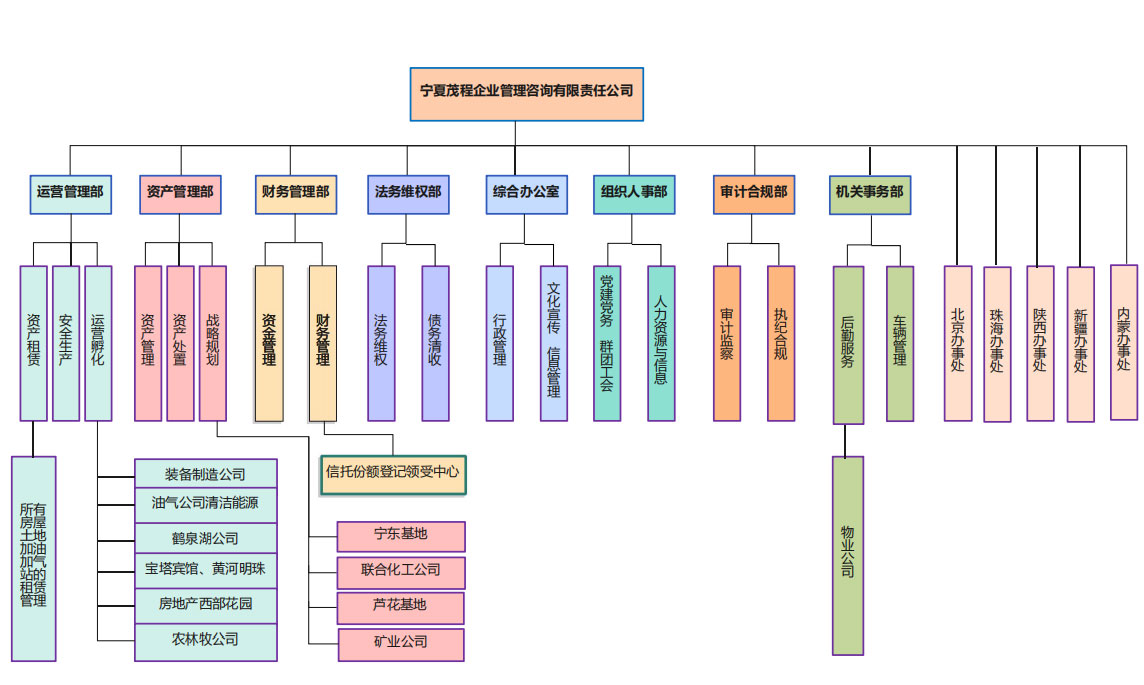公司总经办是企业的执行机构,主要负责全公司的协调组织工作。核心职权是根据董事会明确的授权范围,履行日常经营管理职权(授权清单由董事会另行制定);根据法律规定和信托文件约定,执行信托计划;组织经营管理团队管理、运营和处置信托财产;根据董事会要求,及时归集信托收益;定期向董事会、监事会报告信托财产的管理运行、处置及收支情况;根据董事会授权履行的其他职权。内设八个部门分别为综合办公室、组织人事部、运营管理部、资产管理部、法务维权部、财务管理部、审计合规部和机关事务部。